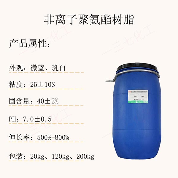 不同與陰離子和陽離子聚氨酯樹脂,采用非離子形態聚氨酯樹脂,具體環保特性,良好的水洗牢度,耐水性好,附著力好,斷裂強度大;常溫低溫,耐曲折性能好,透明度高。